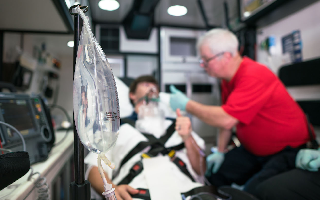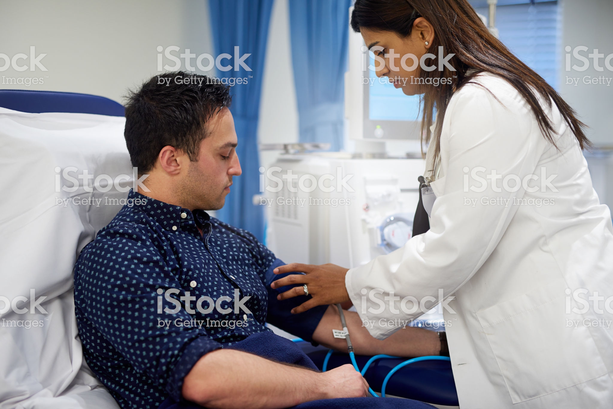 - Medical staff in hospital caring for young man in bed. Man smiling in hospital bed, nurse with hand on his shoulder.