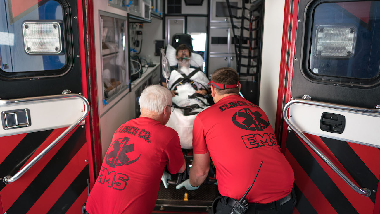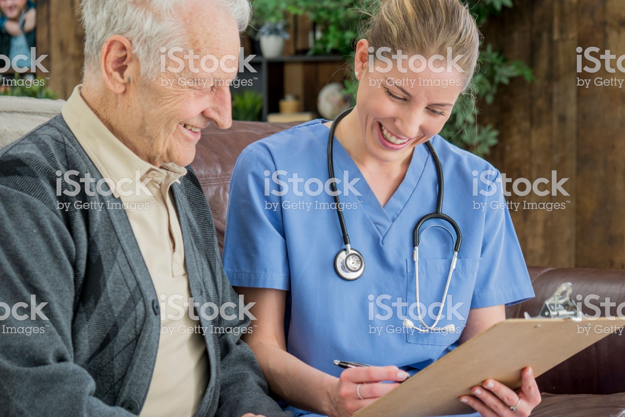 - A Caucasian female nurse is wearing medical clothing. She is with an elderly man wearing casual clothing. They are indoors in his living room. The nurse is checking things off on a clipboard.
