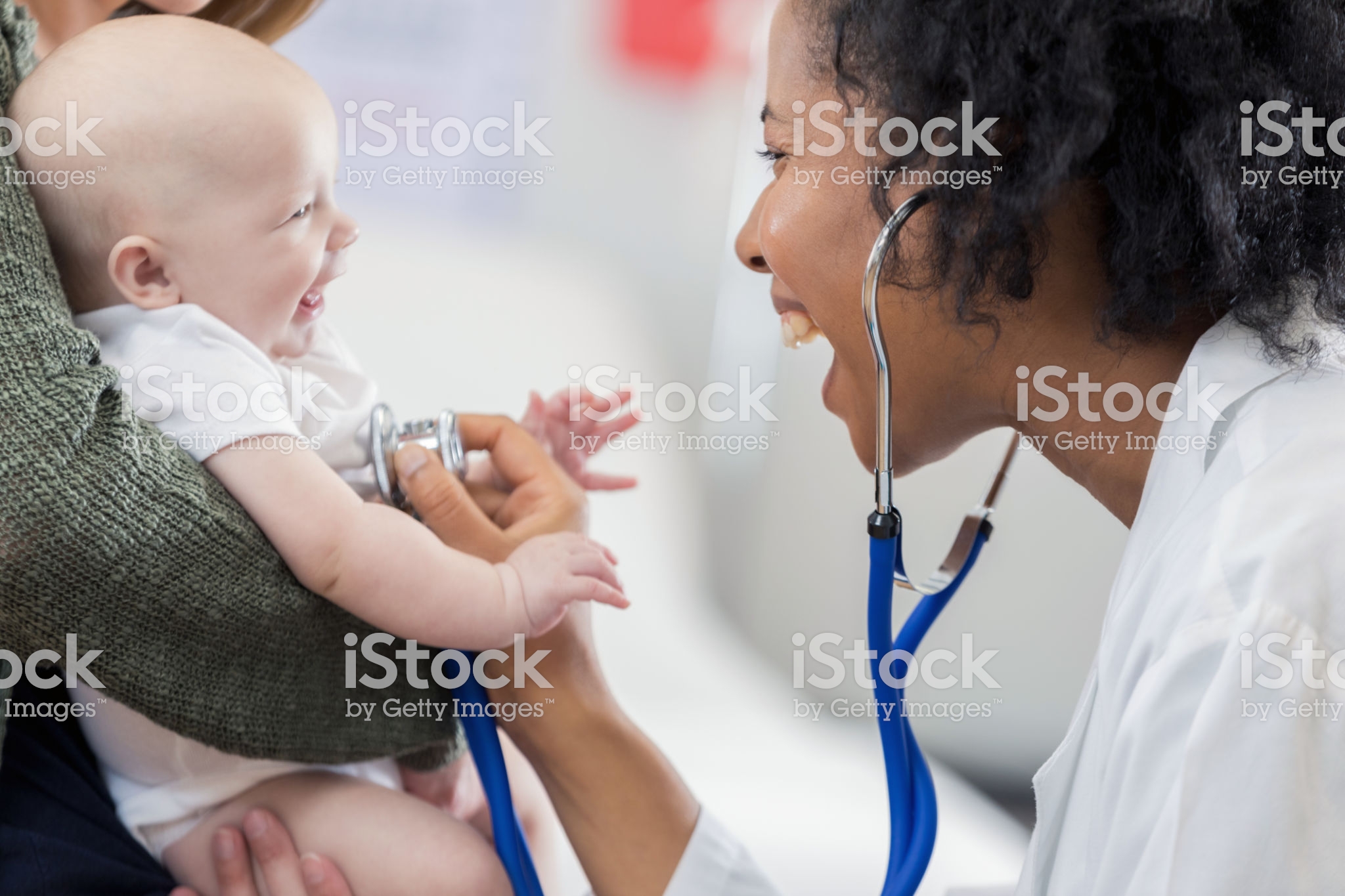 - Happy pediatrician and cute baby girl smile at one another while the doctor listens to the baby’s heartbeat.